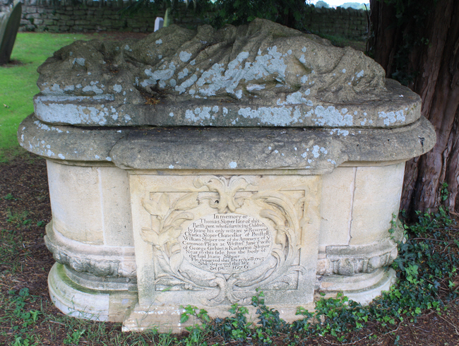 Lying in the shade of an overhanging yew, to the north of the Church there is a fine ‘listed’ table tomb, which records that Thomas Sloper died on 13th April 1703. The most remarkable feature is the stone effigy that surmounts it. Dressed in cerements or grave clothes of exuberant and deeply carved drapery, the figure is assumed to be that of Joane, his wife, who died in 1676. It is modelled on the reclining effigy so often found on interior monuments but almost never seen outside.